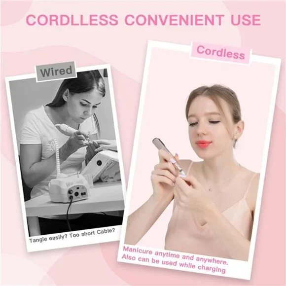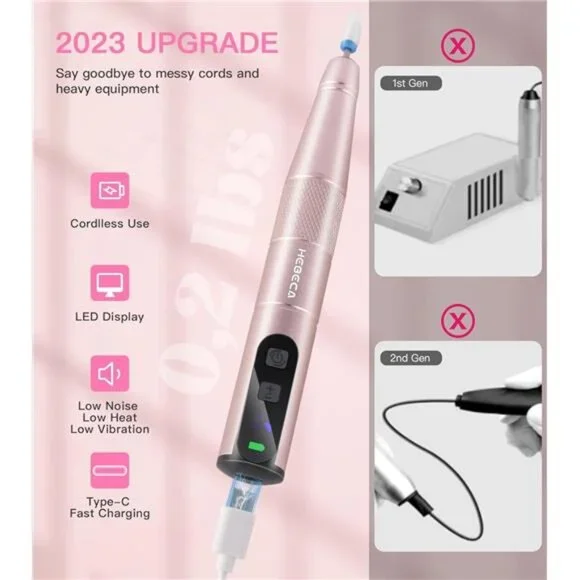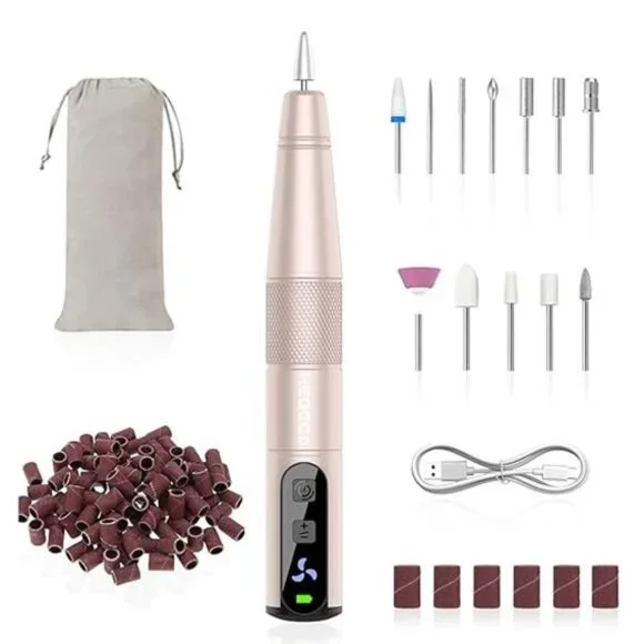 🧿【Salon-Quality Nails Drill at Home】HEBECA electric nail file drill set comes with 12 kinds of 3/32" nail drill bits and 31pcs sanding bands, perfect for all your manicure and pedicure needs, including acrylic nails, gel nails, dip powder nails, cuticles, dead skin, calluses, and thick nails🧿【Cordless Convenience Use】the Cordless nail drill is rechargeable battery powered, comes with a built-in lithium-ion battery, rechargeable nail drill allows you to enjoy your manicure and pedicure time wherever you want without the hassle of annoying cables. Plus,the rechargeable nail file also supports corded operation when the power runs out🧿【Low Heat & Noise & Vibration Nail Filer】the upgraded motor and overload protection mechanism of electric nail drill prevent overheating and extend the service life of our nail drill. Plus, its high-quality bearing structure makes the nail drill machine quiet and low-vibration for a more comfortable experience while doing your nails🧿【Customizable Speeds and Rotations】The cordless nail file with 3 adjustable speed settings (ranging from 0 to 20000rpm) and 2 rotation directions (clockwise and counter-clockwise), this electric manicure and pedicure tools kit offers you complete control over your nail care routine. It's easy to use no matter whether you're left-handed or right-handed. it's user-friendly for beginners