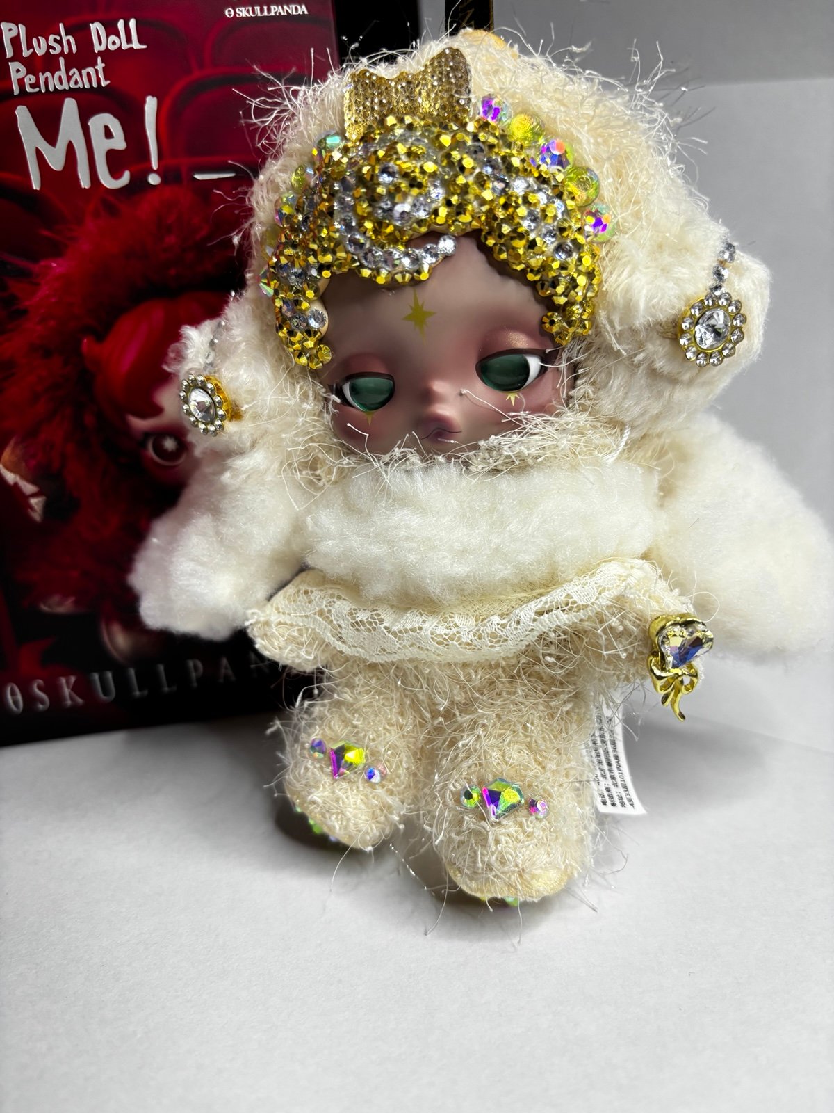 Hand-customized Sandman Skull Panda with premium rhinestones, crystals, and lace accents. Finished with a luxury celestial sparkle design. Perfect for Pop Mart collectors and art toy lovers.