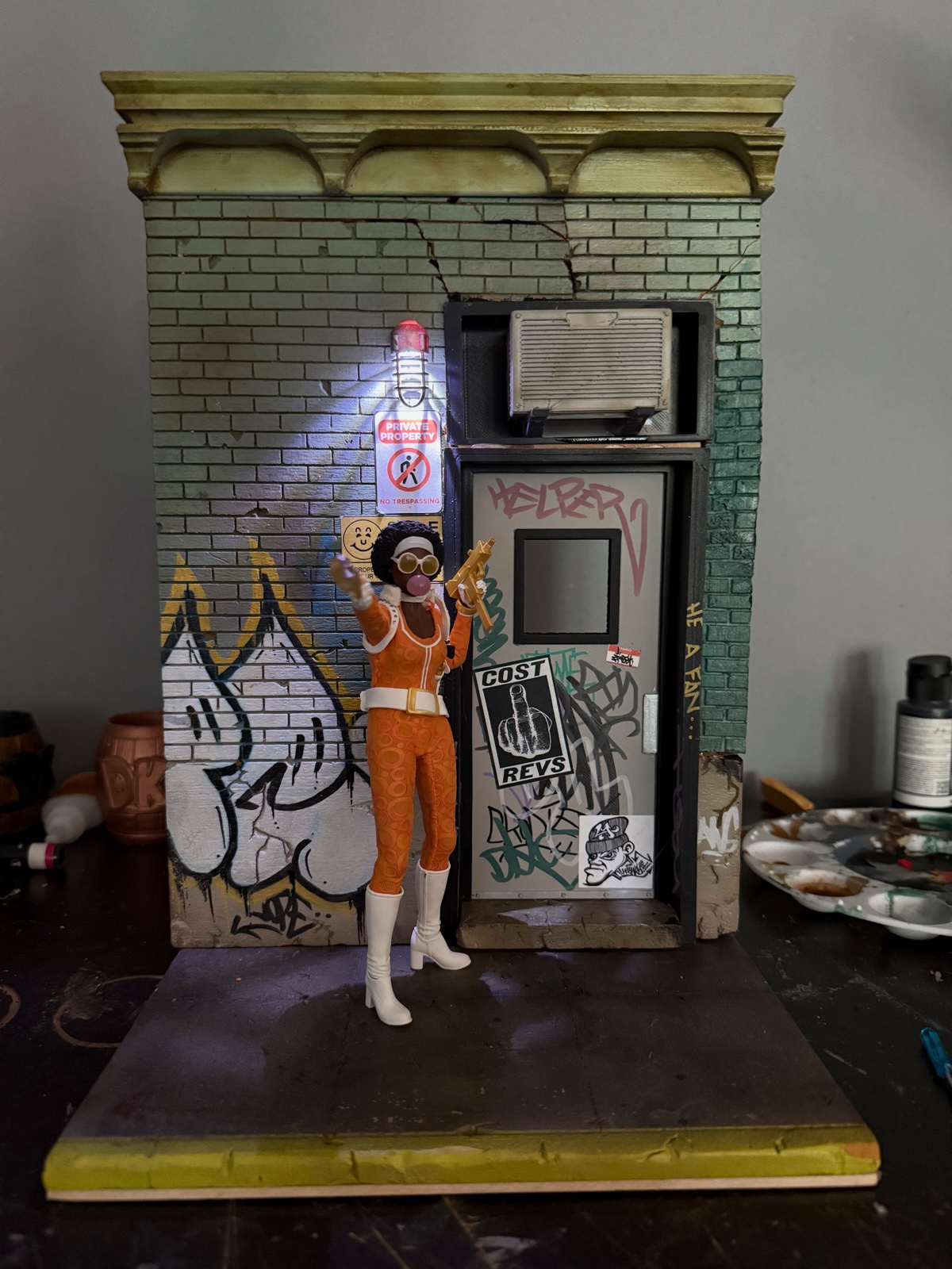 This detailed display features a graffiti-covered brick wall, weathered door, realistic AC unit, and working LED light that casts a cinematic glow. Every crack, sticker, and paint mark tells a story straight out of the city streets.